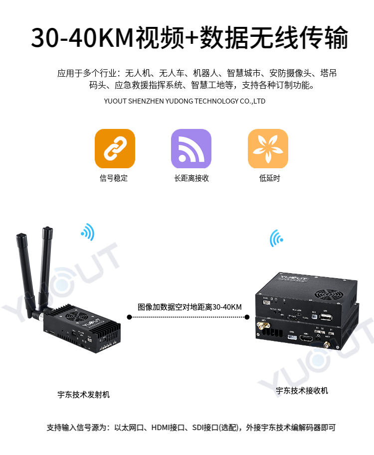 YD-TS0030-WK 是應用于無人機行業的圖數控一體化超遠距離無線傳輸設備(最遠可達 30至40 公里),具有體積小、功耗低、通信距離遠等特點,支持高清視頻、飛控數據、云臺控制數據、遙控器控制數據等同時傳輸。
