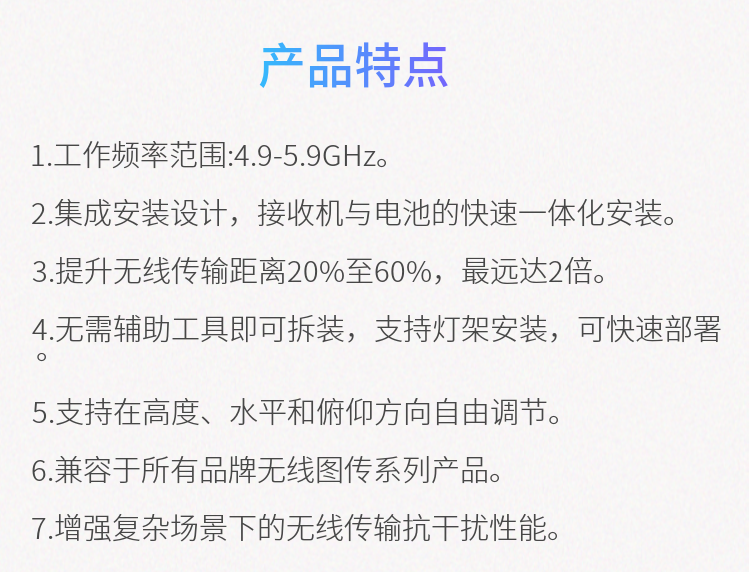 1. 工作頻率范圍:4.9-5.9GHz 2. 集成安裝設計,實現與接收機與電池的快速一體化安裝 3. 無需輔助工具即可拆裝,支持燈架安裝,可快速部署 4. 支持在高度、水平和俯仰方向自由調節, 5. 適用于所有品牌無線圖傳全系列產品 6. 增強復雜場景下的無線傳輸抗干擾性能 7. 提升無線傳輸距離最遠達2倍